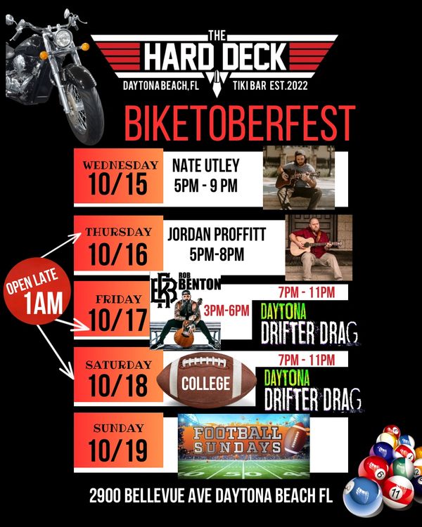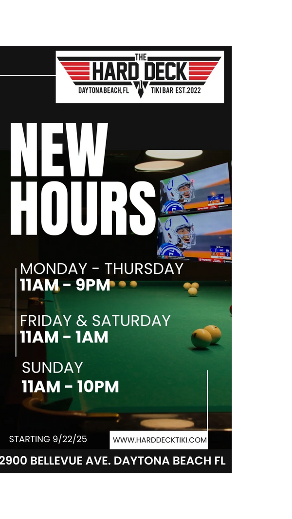 Located off Daytona International Speedway Blvd, The Hard Deck is Daytona’s go-to tiki and sports bar—known for mouthwatering burgers, ice-cold drinks, live music, and over 20 flat screens for nonstop sports. We’re family-friendly, dog-friendly, & the perfect spot for locals, bikers, and beach goers to relax and enjoy